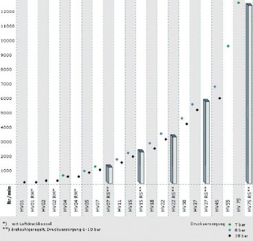 Kompressoren mit konstanter Drehzahl bieten einen optimalen Wirkungsgrad, wenn sie im Volllastbetrieb arbeiten, weisen jedoch im Teillastbereich einen Energieverlust auf. Die Serie HVRS regelt die Verdichterdrehzahl mit einem modernen Wechselrichter genau entsprechend dem Luftbedarf. Weitere Merkmale der Verdichter der HVRS-Serie sind geregelter Anlauf und Abschalten mit der Bezeichnung ‘Supersoft’, ein vom Kunden einstellbarer ‘Systemdruck’ und eine einfache Installation mit einem einsatzbereiten Paket. | Verfügbare Luftversorgung bei 6 bis 10 bar